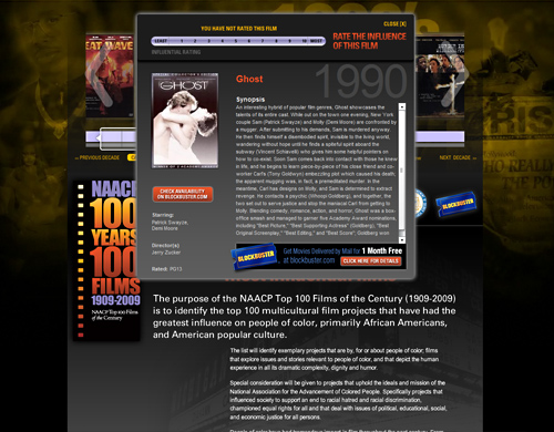 Working in concert with Blockbuster, NAACP, and an ad agency, Humankind built a powerful backend system to deliver dynamic data to the Flash UI and collect user information.